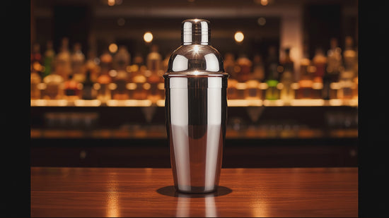 Esta coctelera de acero inoxidable con acabado de espejo incluye una tapa y un colador incorporado.