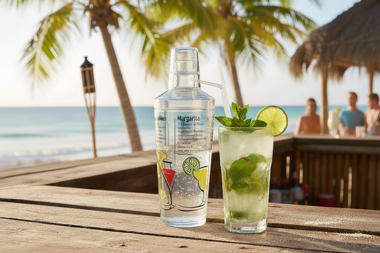 Cet ensemble comprend un shaker à cocktail, un pilon, un doseur gradué et un presse-agrume. Il y a 6 recettes de boissons imprimées à l'extérieur du shaker. Les recettes incluent : Mint Julep, Cosmopolitan, Margarita, Mojito et Manhattan.