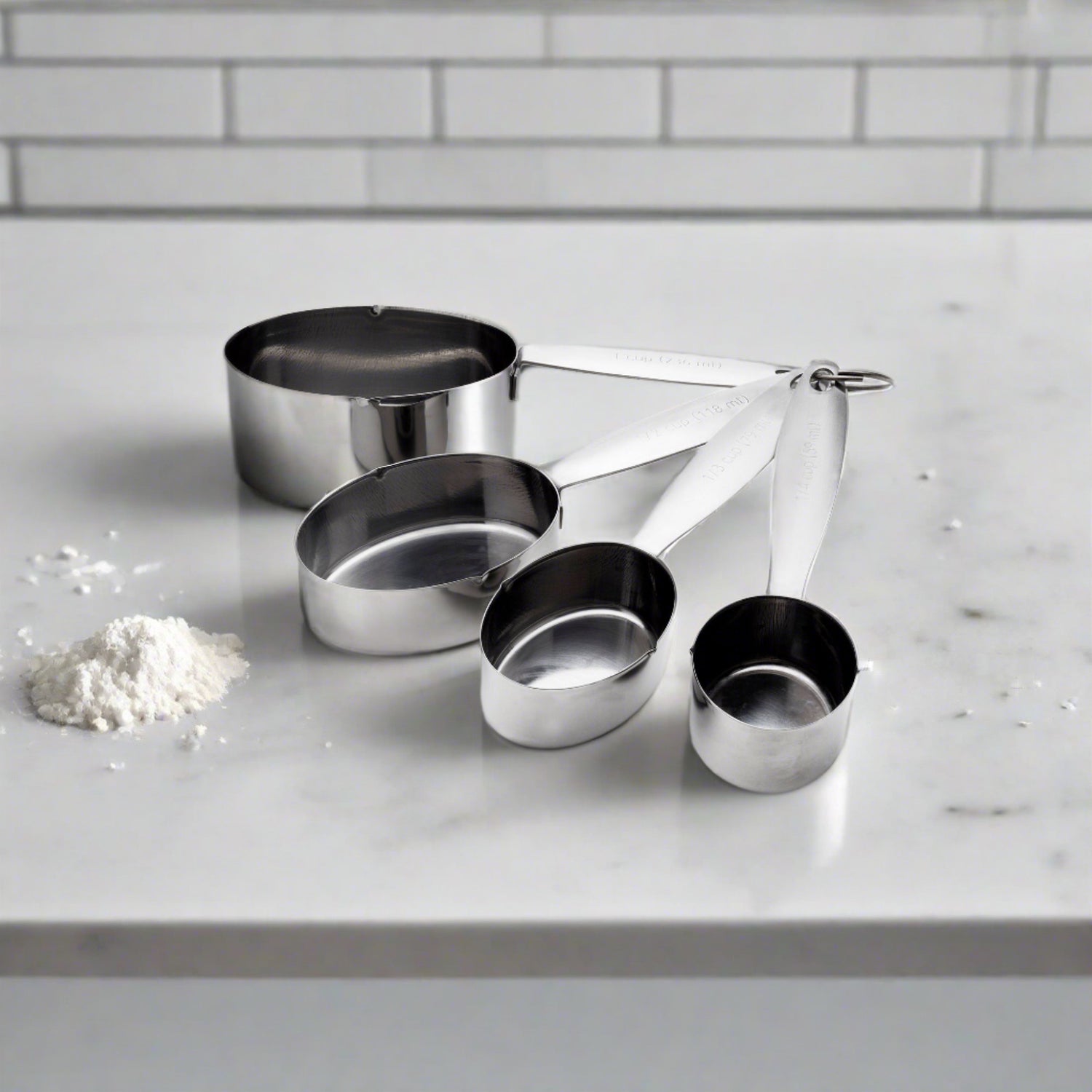 This handy and sturdy stainless steel measuring cup set is built to last a long time and is secured with a metal ring so that the measuring cups won't be misplaced.