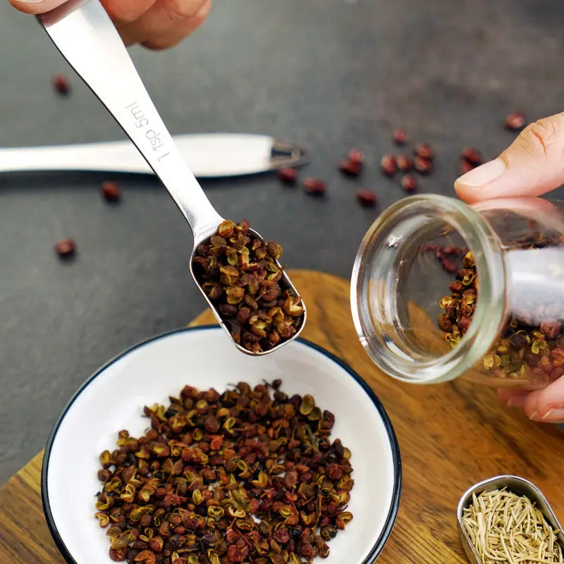 Includes: 1/8 tsp (0.5ml), 1/4 tsp (1.25ml), 1/2 tsp (2.5 ml), 3/4 tsp (3.7 ml), 1 tsp (5 ml), and 1 tbsp (15 ml)