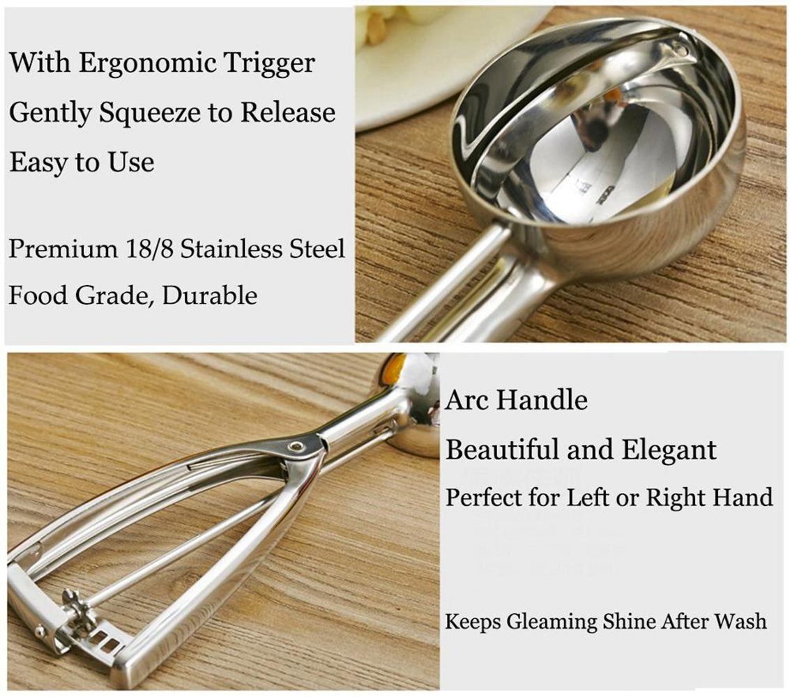 Dispense your ice cream, mashed potatoes, or precise portions of cookie dough quickly and easily with the classic-looking scoop. Features a sturdy stainless steel construction and an easy-squeeze handle.